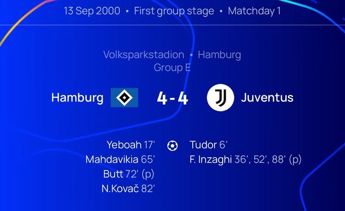 神恰巧!尤文前次在欧冠4-4是00年踢汉堡,科瓦奇、图多尔均破门
