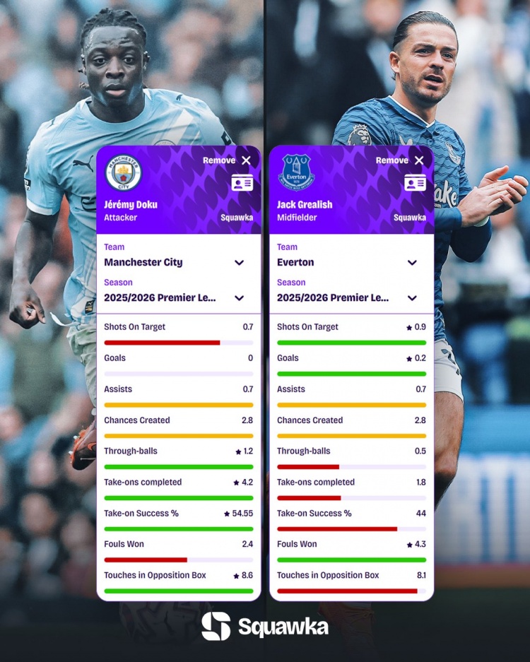 10月17日讯 北京时间未来晚上,曼城将在英超第8轮比赛中主场对阵埃弗顿,Squawka统计了多库、格拉利什本赛季英超每90分钟的数据,并作出对比。