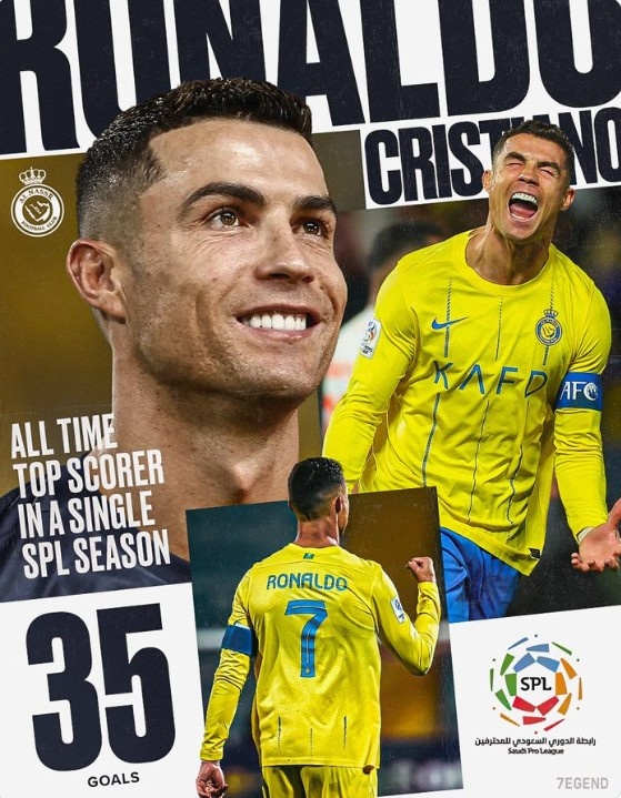 在2023-24赛季,C罗以35球排在弓手榜榜首,并在接下来的赛季中再进25球,告成卫冕金靴。