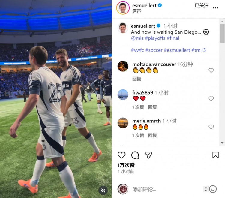 温哥华白浪前卫穆勒更新社媒动态,瞻望西区决赛,他写谈:“现时咱们等着圣迭戈FC。”