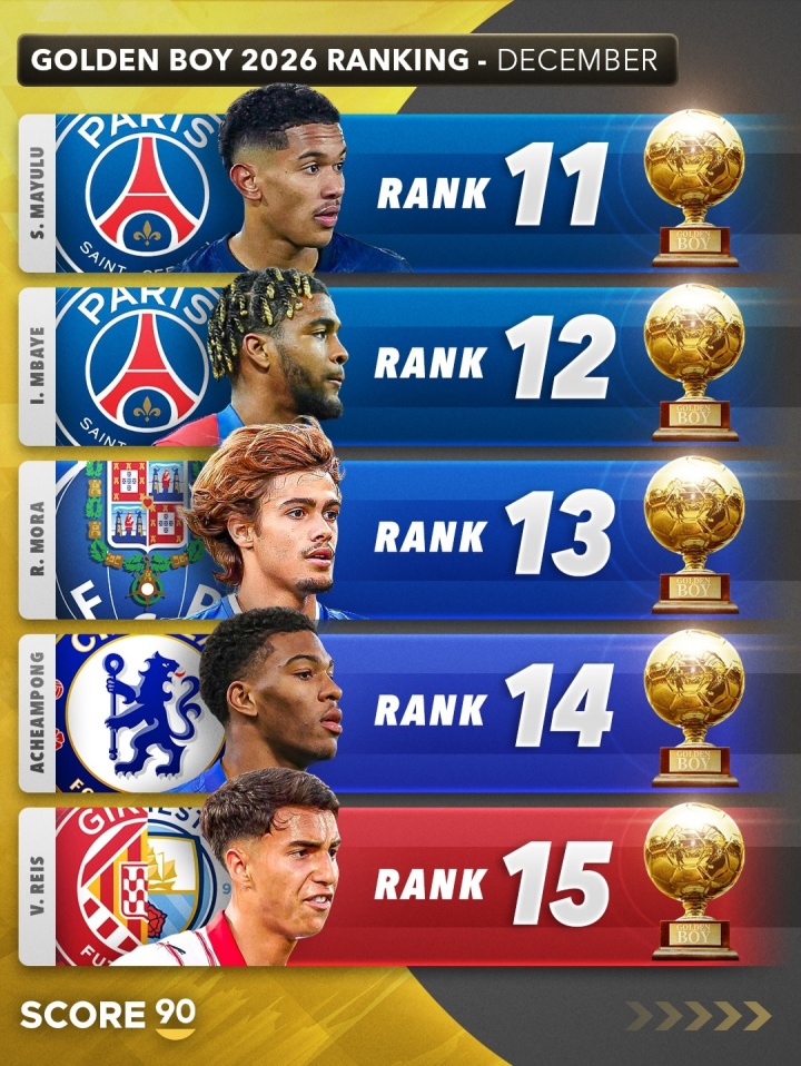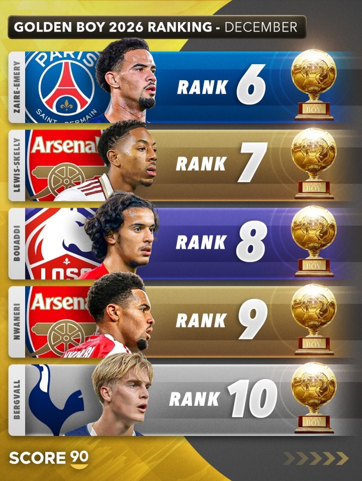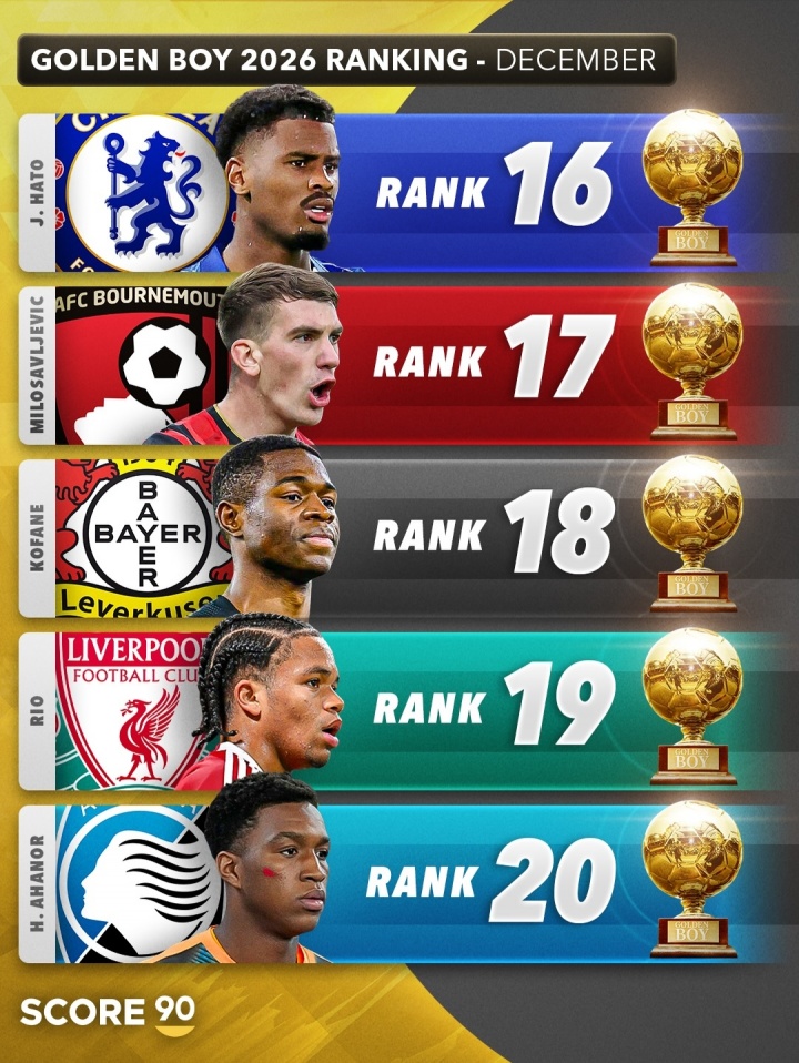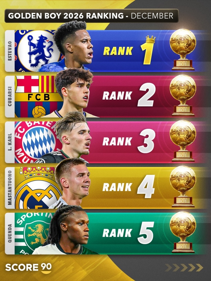 12月04日讯 Score90列出了2026年金童排行展望,埃斯特旺居首,库巴西、卡尔分列二三。