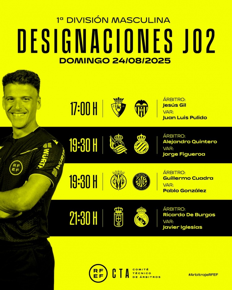 8月23日讯 西甲官方更新社媒动态,公布了当地时辰8月24日(本周日)四场比赛的裁判安排。