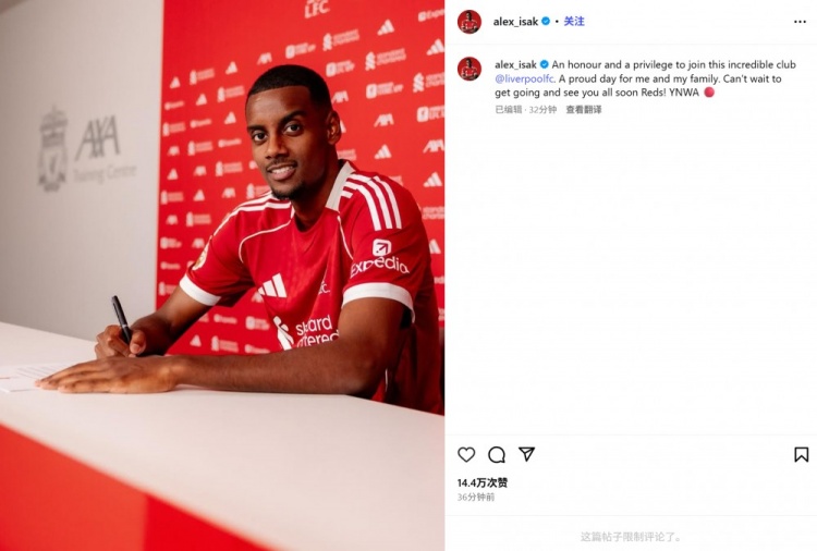 伊萨克暗示:“很庆幸大要加入利物浦这个不行念念议的俱乐部。对我和我的家东说念主来说,这王人是值得骄傲的一天。迫不足待地想尽快见到你们,赤军们!YNWA(永不独行) 🔴”