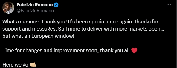 冬窗邂逅!夏窗精采关窗,罗马诺感谢球迷:记得的夏天,谢谢天下