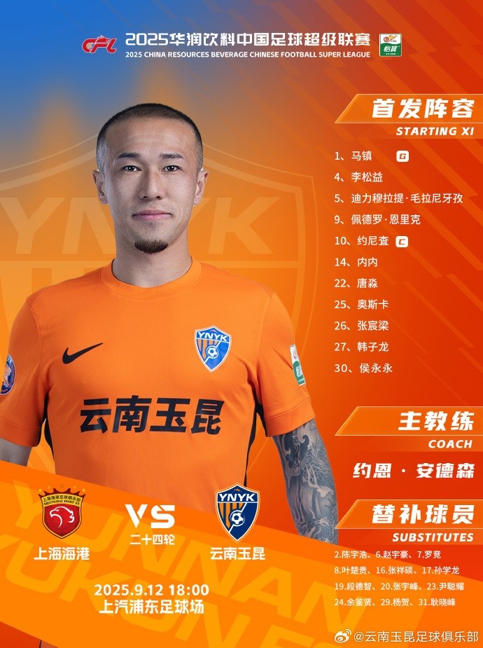 上海海港vs云南玉昆 本场比赛首发威望出炉