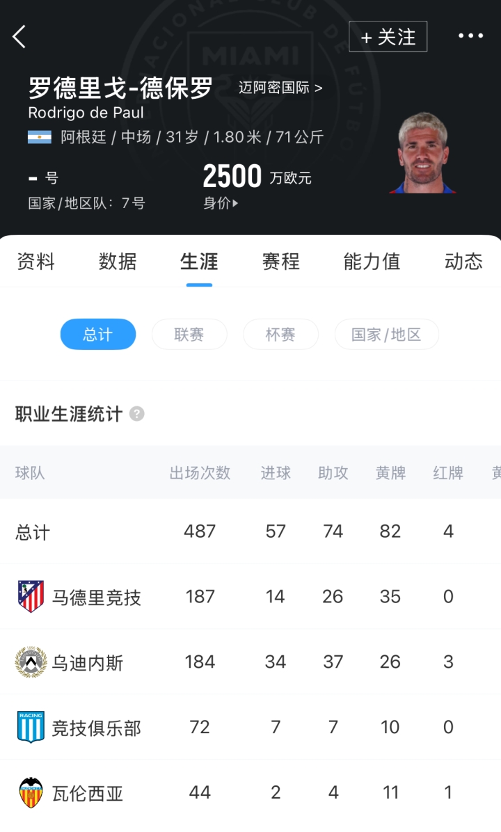 2021年德保罗以3500万欧转会费加盟马竞。当今代表马竞出场187场,打进14球并送出26次助攻。
