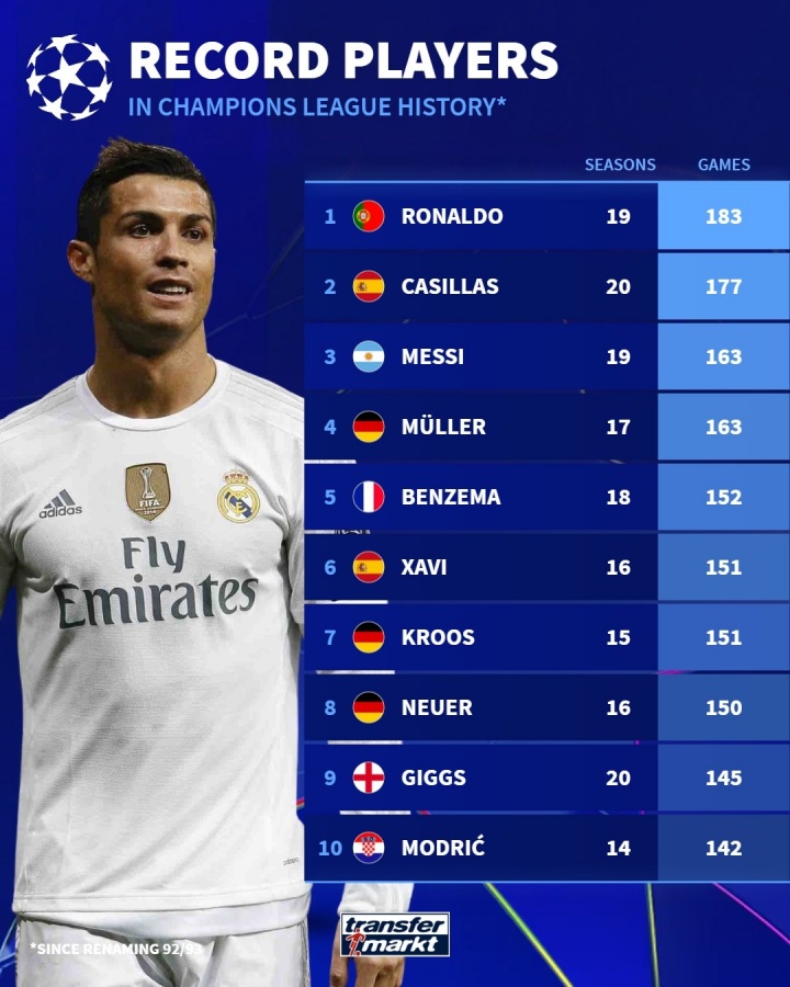 皇萨仁霸榜!欧冠历史出场榜:C罗183场居首,诺伊尔有望干预前三