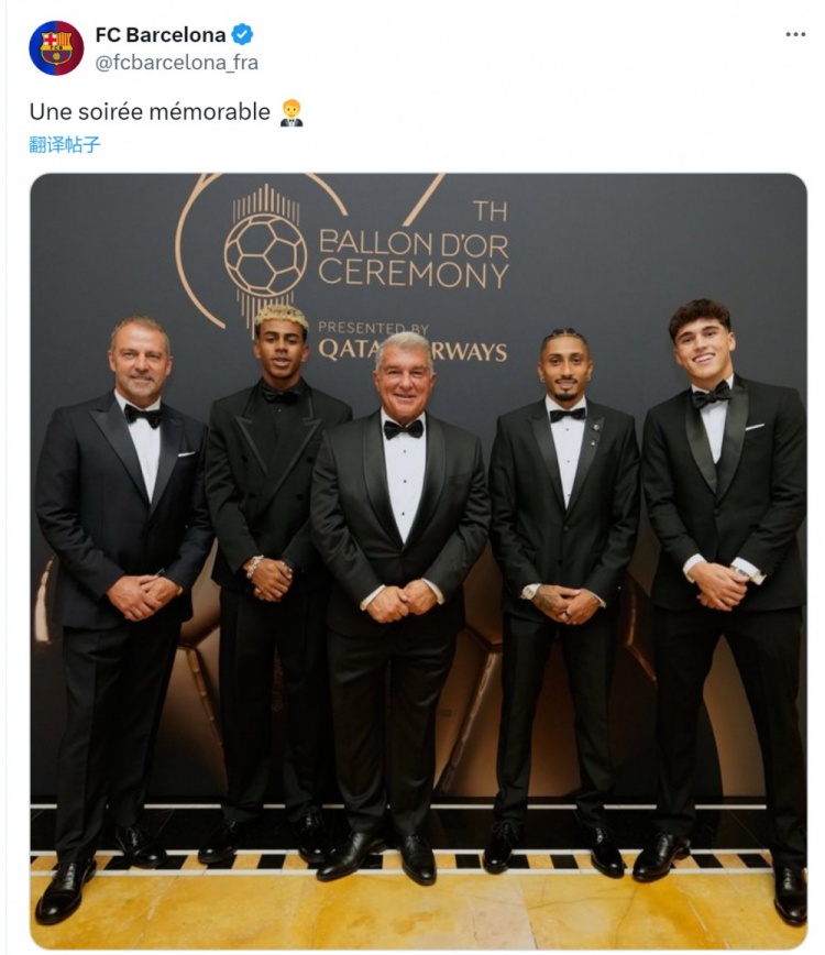 拉波尔塔、弗里克、亚马尔、拉菲尼亚、库巴西出席金球奖受奖仪式,巴萨官方社媒晒出他们的合照,配文:“一个牢记的夜晚。”