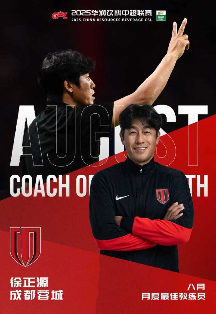 9月25日讯 中超官方音讯,蓉城主帅徐正源当选8月最好解释。