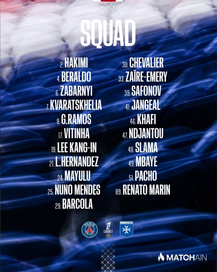 巴黎本场比赛大名单: