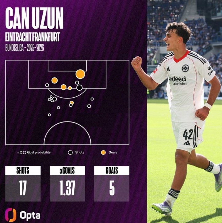 9月30日讯 本赛季法兰克福19岁小将乌尊现象出色,纠合5场德甲破门,5场比赛5球3助攻。