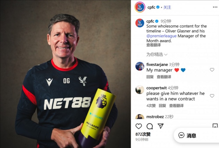 10月14日讯 水晶宫官方晒照,主教化格拉斯纳领取9月份英超最好教化奖项。