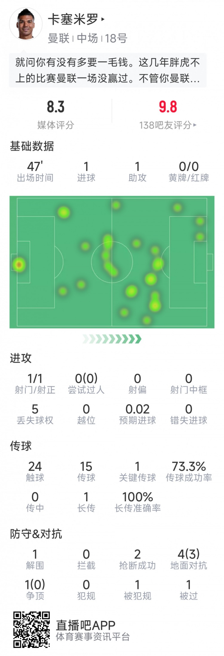 卡塞米罗半场数据:1传1射,2次抢断,5抵挡3生效,1关键传球