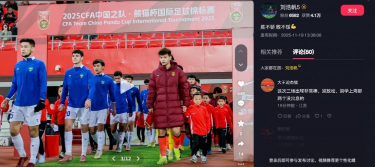 2025年熊猫杯落下帷幕,U22国足1胜1平1负得到亚军,手脚球队队长,刘浩帆三场比赛沿途首发且打满270分钟。今天,刘浩帆发文回想熊猫杯,他写谈:胜不骄 败不馁。