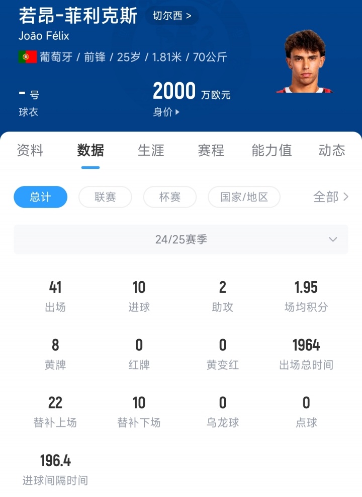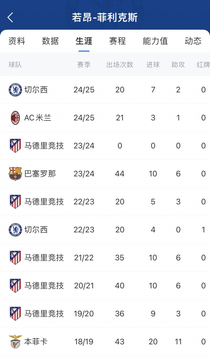 2023年1月,菲利克斯租赁加盟切尔西,开启了我方的流浪糊口。两年间菲利克斯先后迤逦马竞、巴萨、切尔西、AC米兰4支球队,但在每支球队效能皆没能朝上半年,如今他远走沙特加盟利雅得顺利。