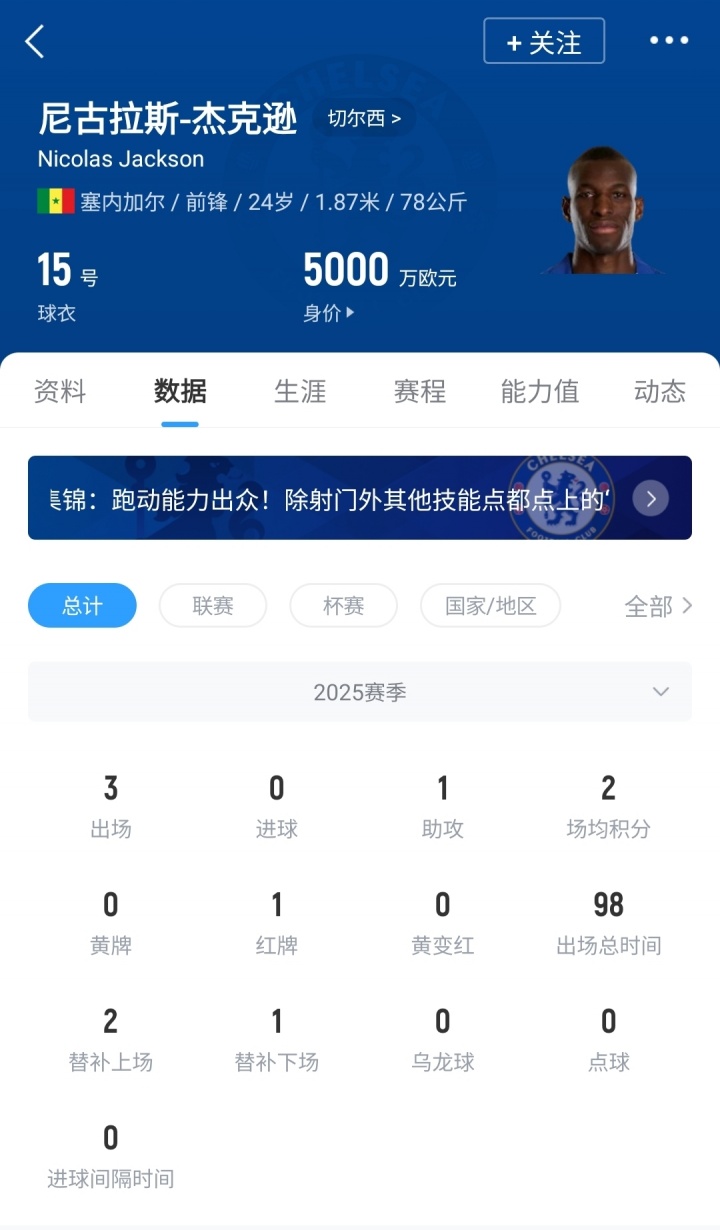 24岁的塞内加尔先锋杰克逊,上赛季代表切尔西出战34场比赛,孝敬13粒进球和5次助攻,刻下杰克逊的德回身价为5000万欧元。