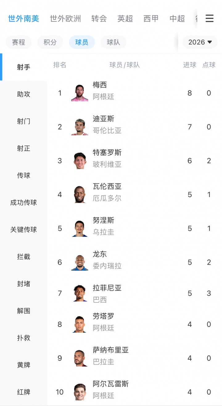 当今在南好意思世初赛弓手榜上,梅西8球0点球排在第一,迪亚斯第二。劳塔罗和阿尔瓦雷斯投入前十。