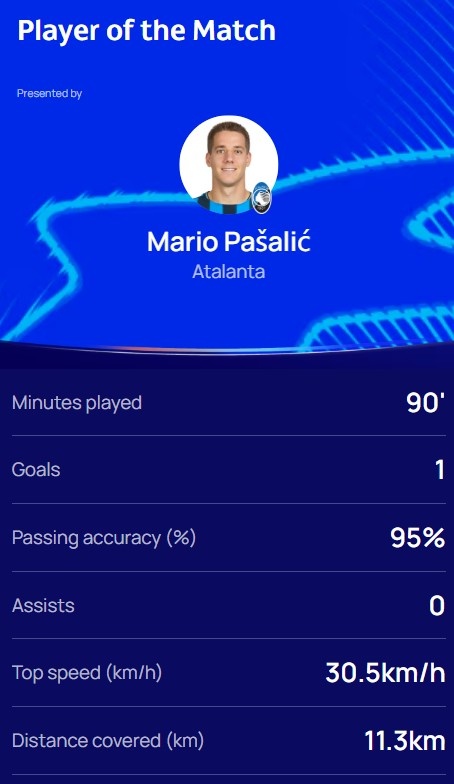 本场比赛帕萨利奇打进绝杀,全场跑动距离11.3km,传球见服从95%,赛后他也当选欧冠官方本场最好球员。