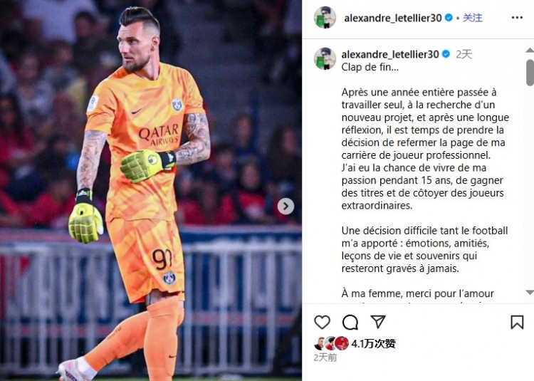 34岁前巴黎圣日耳曼门将莱特利尔在社媒晓谕,舍弃15年的职业生计。
