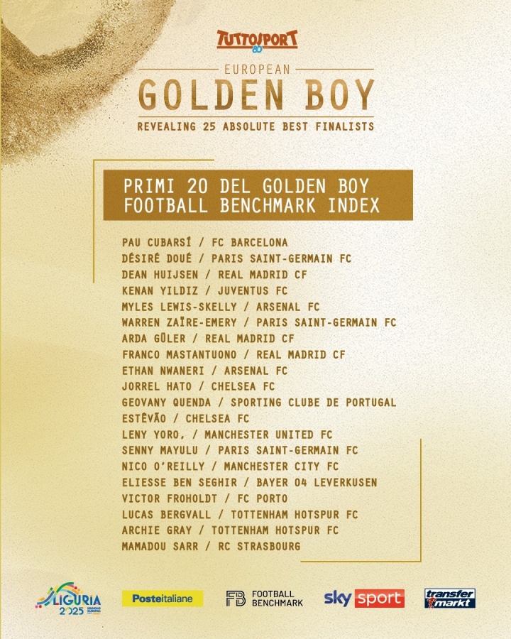 金童奖公布25东谈主候选,库巴西、杜埃、怀森、斯凯利、居莱尔、小贝林厄姆在列。