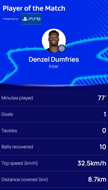 本场比赛中邓弗里斯出场77分钟,打进1球,10次赢回球权,冲刺速率最快32.5km/h,赛后他也当选欧冠官方评比出的本场最好球员。