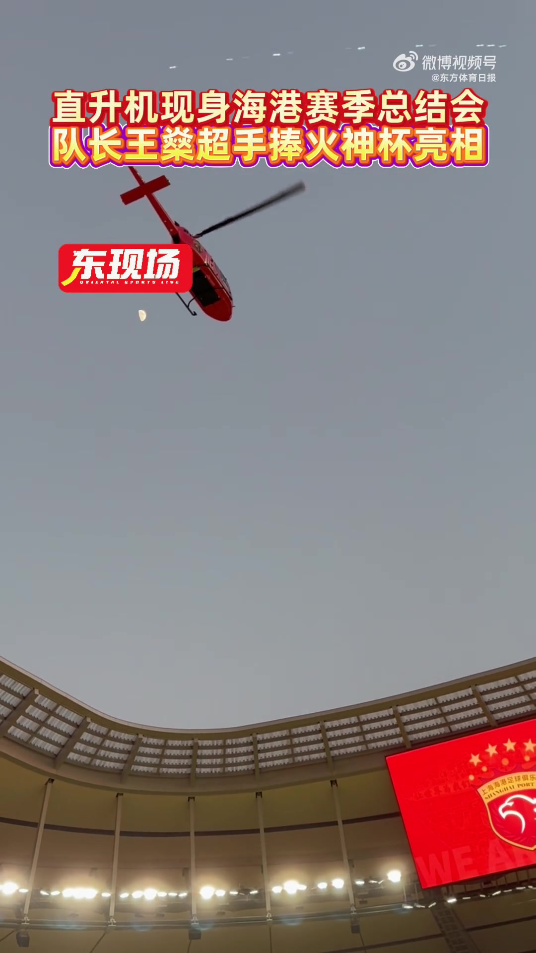 直升机现身海港赛季回归会!队长王燊超手捧火神杯亮相