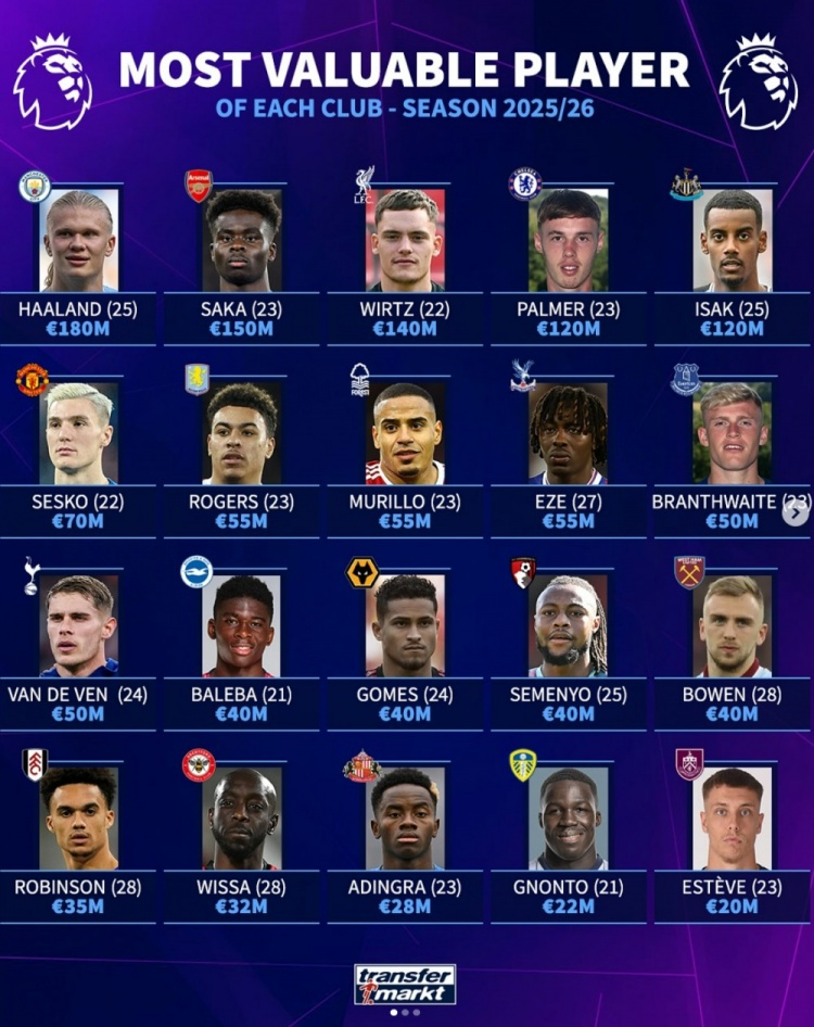 8月17日讯 新赛季英超仍是开幕,德转也清点了英超20支球队中身价最高的球员,其中哈兰德1.8亿欧领衔,具体如下: