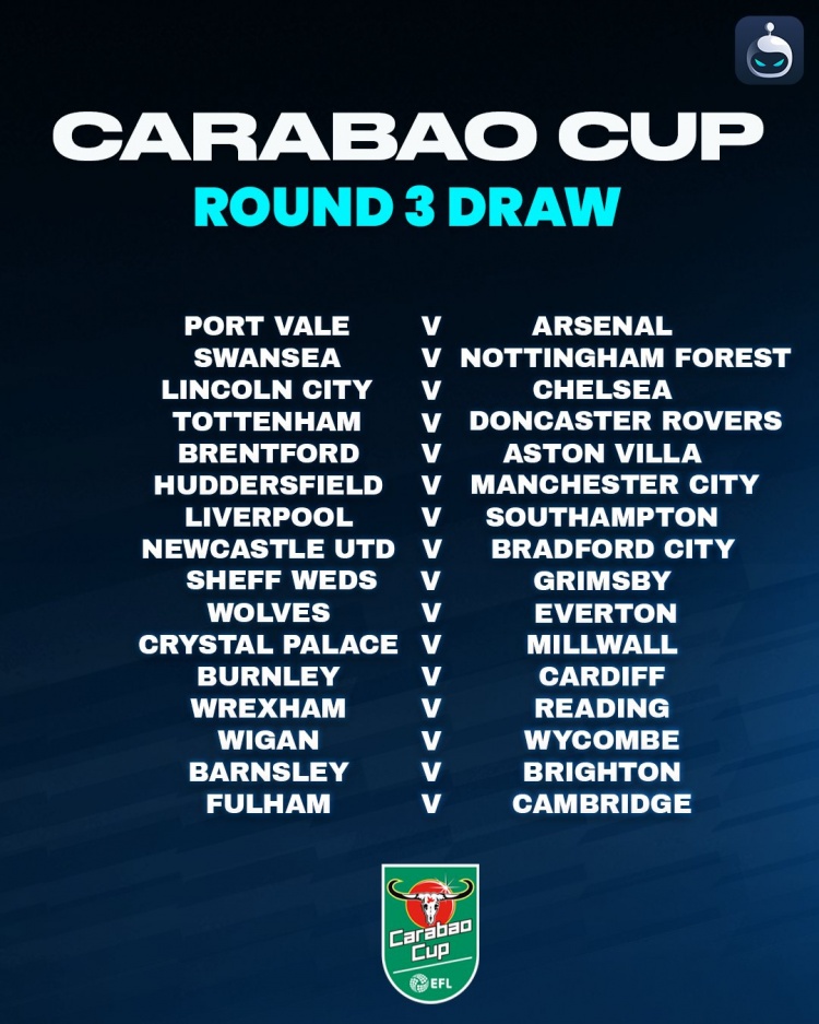 8月28日讯 英格兰联赛杯第三轮抽签效果揭晓,具体如下: