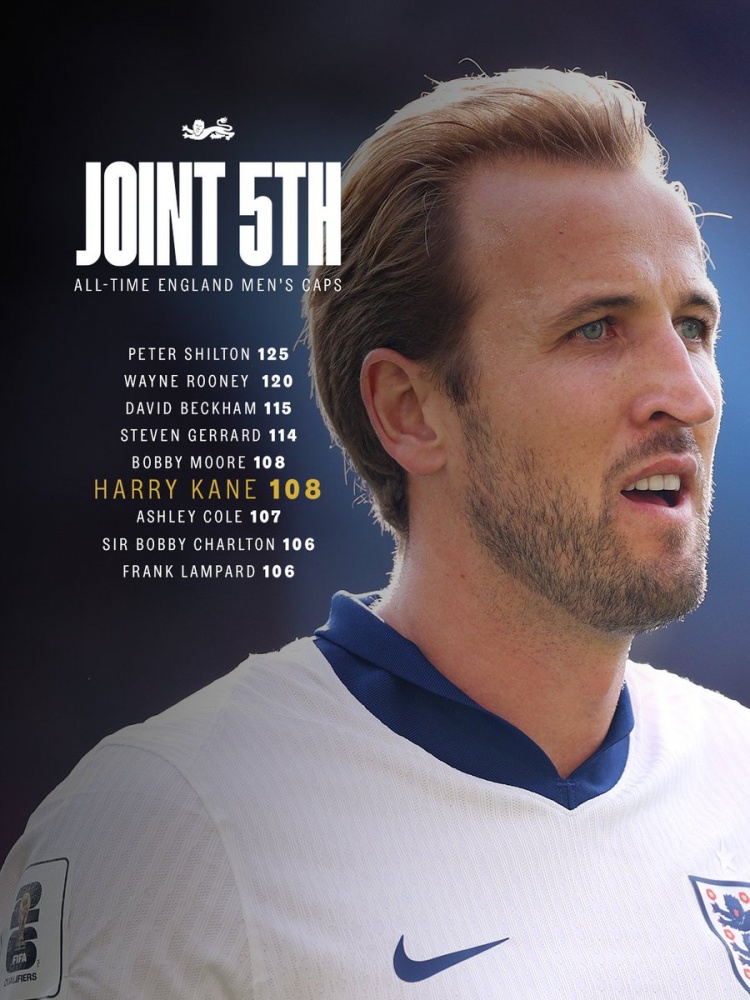 在英格兰2-0安说念尔的比赛中,凯恩迎来了在英格兰队的第108次出场,追平博比-摩尔,并排英格兰队史第5。