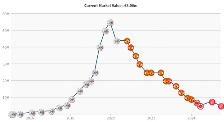 2019年底,范德贝克的身价达到了生存巅峰的5500万欧,之后一谈下滑,2020年夏窗,曼联破耗3900万欧引进范德贝克,效用曼联4年间,范德贝克只为曼联出战62场比赛,孝顺2球2助。范德贝克在曼联两度被外租,也齐莫得好的进展,他时时遇到伤病,现身价仅剩500万欧。