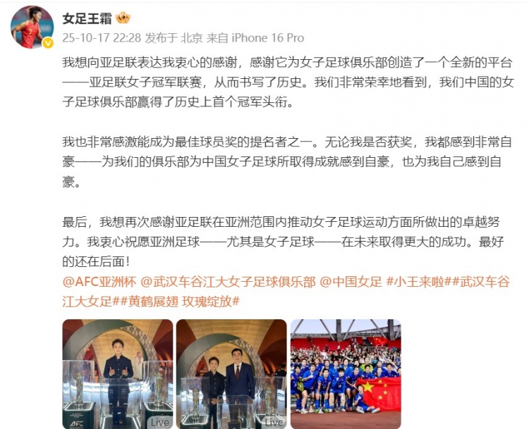 10月17日讯 亚足联年度受奖庆典放弃,王霜无缘年度最好女足球员奖项。尽管如斯,王霜仍在个东谈主酬酢媒体发文致谢亚足联。