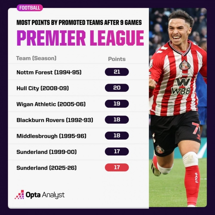 哪怕你是想象力额外丰富的球迷,忖度也不会在展望新赛季英超排行时,把升班马放在前方。这项赛事素来竞争浓烈,既有 BIG6 权门镇守,也有不少新贵争夺欧战阅历,对新球会来说的确很 “不友好”。不外桑德兰却 “不这样想”,上赛季他们在英冠(二级赛事)打出佳绩班师升级后,本赛季更进一步,9 轮战罢位列前四,简直令东谈主大跌眼镜,黑猫是真不好惹!