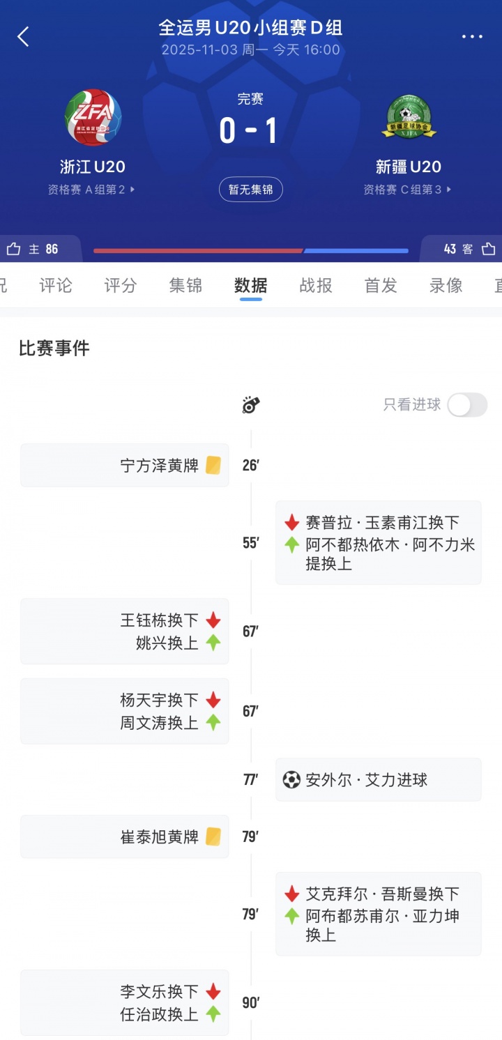 11月3日讯 全运会男足U20小组赛第2轮,浙江U20队0-1不敌新疆U20队,据“沿途贯通汇”报谈,浙江U20队主帅王政赛后禁受了媒体采访。