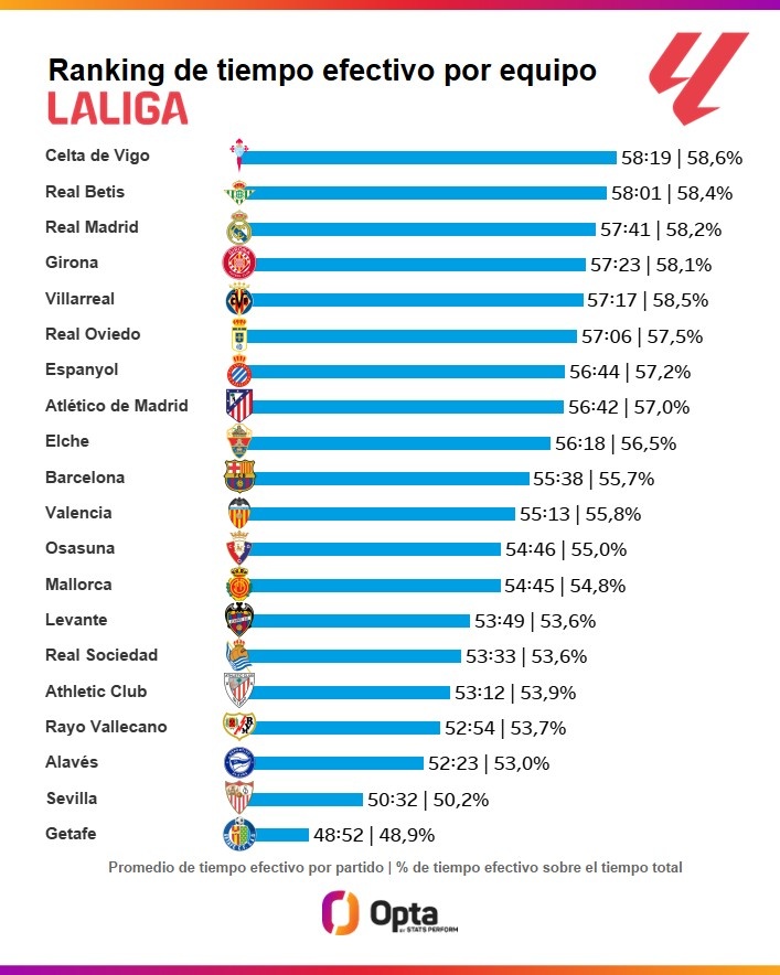 本赛季西甲场均净比赛技艺榜:皇马57分41秒第三,巴萨55分38秒