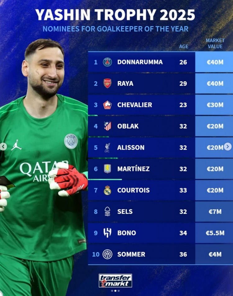 雅辛奖候选东谈主身价榜:多纳鲁马居首,拉亚次席&切瓦利耶第三