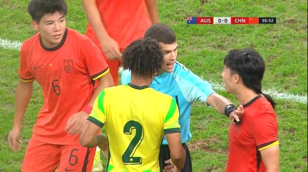 09月09日讯 U23亚洲杯预选赛第3轮,澳大利亚U23vs中国U22。比赛第31分钟,澳大利亚球员基利-亚当森在明知球已出界死球的情况下将球射入彀窝,评判员与其计议后辖下海涵莫得出牌。